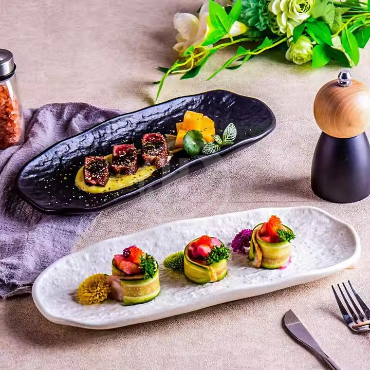 You are here:Home » Products » Ceramic Plates » Creative Japandi Sushi Breakfast Dish Frosted White Black Rock Pattern Rectangular Ceramic Plate for Household & Commercial Use